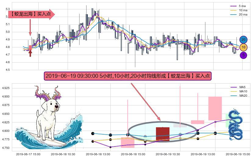 形态多维评估: ⚀ 2019-06-19 09:30:00小时显现 5小时-10小时-20小时均线 【蛟龙出海】买入点 看多信号,后市看涨,买入