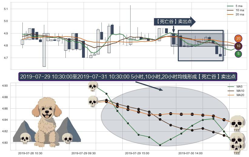 形态多维评估: ⚀ 2019-07-29 11:30:00-小时至2019-07-31 10:30:00-小时显现 5小时-10小时-20小时均线 【死亡谷】卖出点 看空信号,后市看跌,卖出