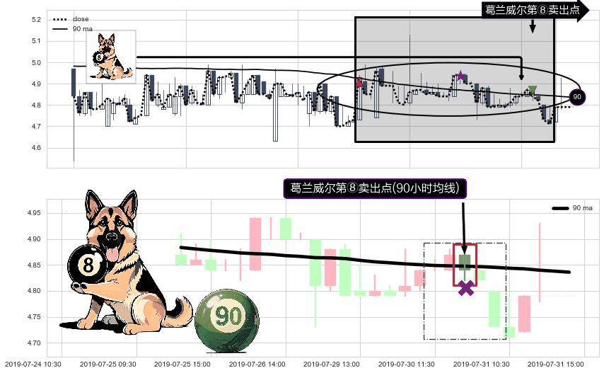 形态多维评估: ⚀ 2019-07-30 14:00:00-小时显现 葛兰威尔均线 90小时均线 第⑧卖出点 下降趋势的中继信号,后市看跌,卖出信号