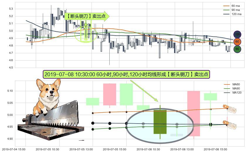 形态多维评估: ⚀ 2019-07-08 10:30:00小时显现 60小时-90小时-120小时均线 【断头铡刀】卖出点 看空信号,后市看跌,卖出