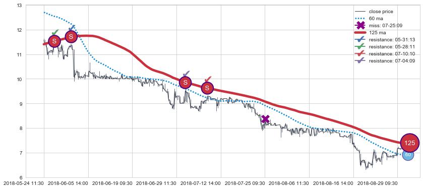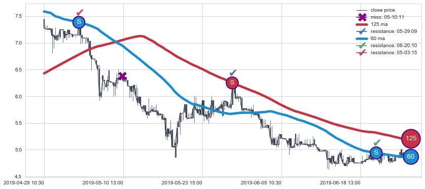 下跌趋势04-29 10:30-06-25 09:30,均线60, 125确认关键阻力3处