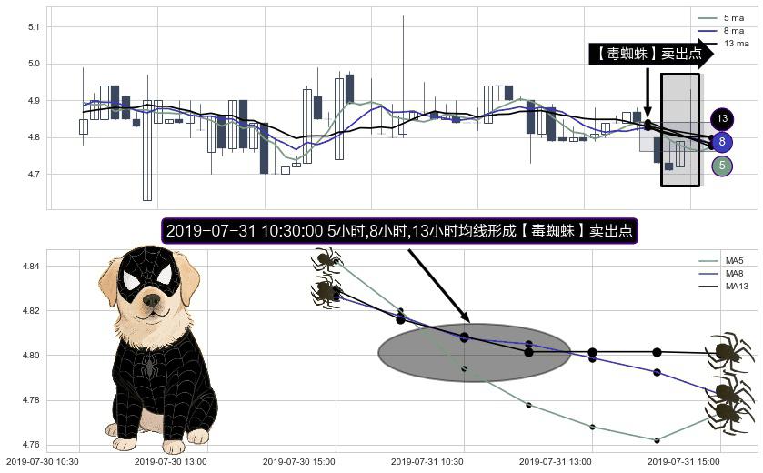 形态多维评估: ⚀ 2019-07-31 10:30:00小时显现 5小时-8小时-13小时均线 【毒蜘蛛】卖出点 看空信号,后市看跌,卖出