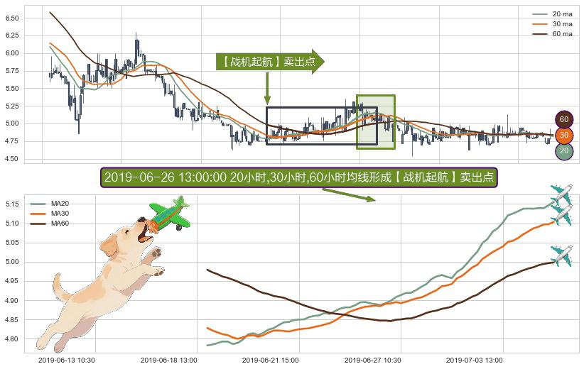 形态多维评估: ⚀ 2019-06-18 15:00:00小时-2019-07-05 10:30:00小时显现 20小时-30小时-60小时均线 【战机起航】卖出点 看空信号,后市看跌,卖出