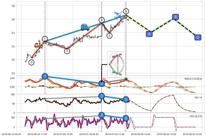 ➣ 1,3,5驱动浪MACD, RSI, KDJ走势都出现【常规背离】反转信号增强