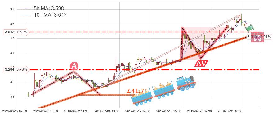 ♘ 在最后的上升阶段2019-06-19 10:30至2019-07-31 10:30存在 持续未破位的支撑位 ,支撑价格3.510,支撑可信任强度87.98%,其距离最后价格3.600相差 -2.51%