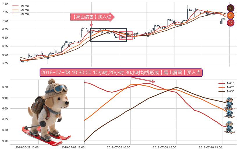 形态多维评估: ⚀ 2019-07-03 13:00:00小时-2019-07-10 14:00:00小时显现 10小时-20小时-30小时均线 【高山滑雪】买入点 看多信号,后市看涨,买入