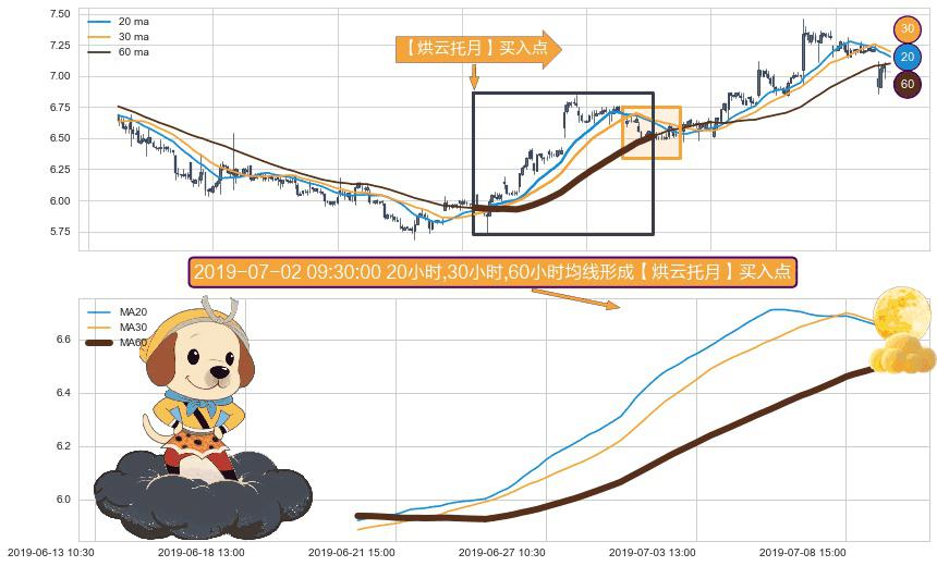 形态多维评估: ⚀ 2019-06-21 09:30:00小时-2019-07-09 15:00:00小时显现 20小时-30小时-60小时均线 【烘云托月】买入点 看多信号,后市看涨,买入