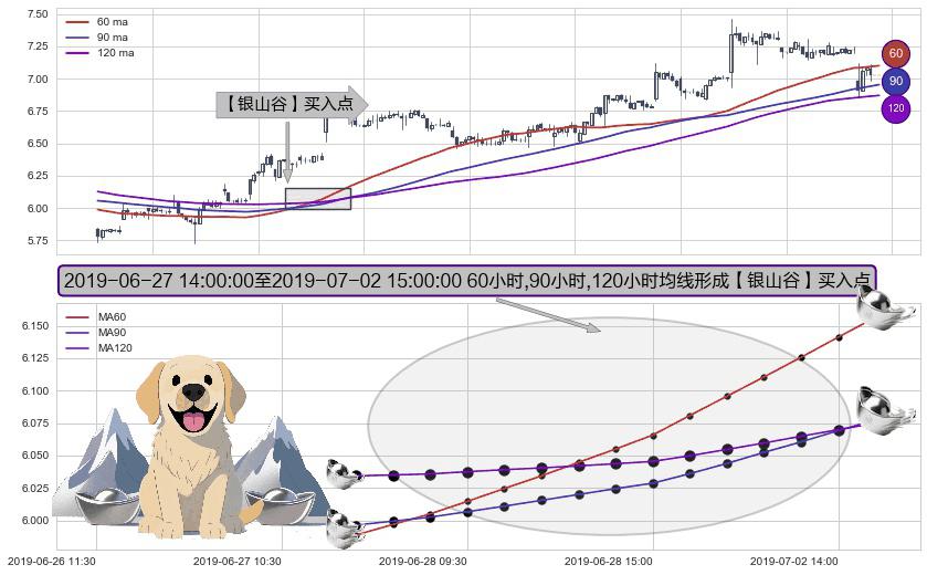 形态多维评估: ⚀ 2019-06-27 15:00:00-小时至2019-07-02 15:00:00-小时显现 60小时-90小时-120小时均线 【银山谷】买入点 看多信号,后市看涨,买入