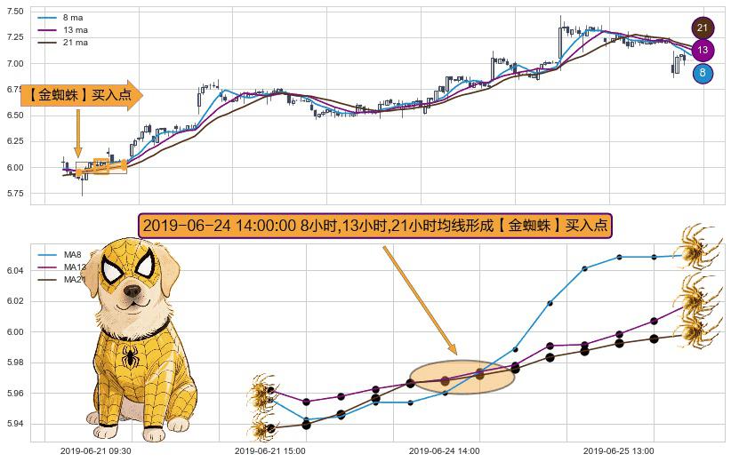形态多维评估: ⚀ 2019-06-24 14:00:00小时显现 8小时-13小时-21小时均线 【金蜘蛛】买入点 看多信号,后市看涨,买入