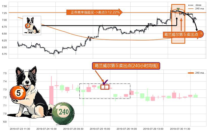 形态多维评估: ⚀ 2019-07-25 14:00:00-小时显现 葛兰威尔均线 240小时均线 第⑤卖出点 上升趋势均值回复的短线回落信号,后市看跌,卖出信号