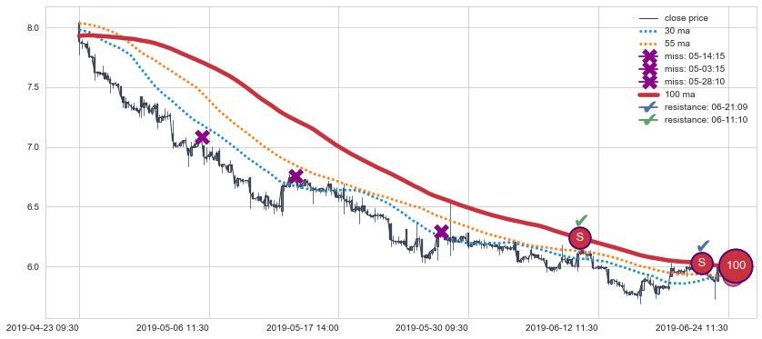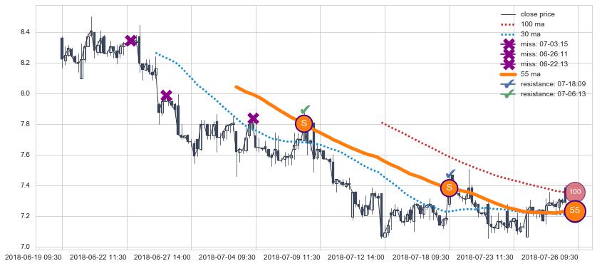 下跌趋势06-19 09:30-07-26 09:30,均线55确认关键阻力2处