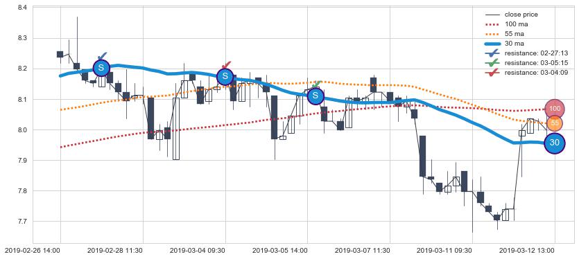 下跌趋势02-26 14:00-03-12 13:00,均线30确认关键阻力3处