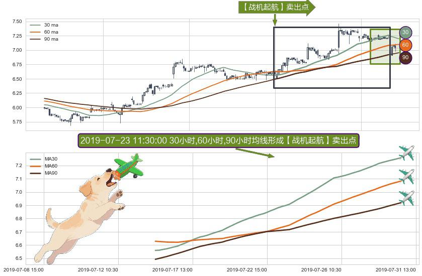 形态多维评估: ⚀ 2019-07-15 15:00:00小时-2019-07-30 15:00:00小时显现 30小时-60小时-90小时均线 【战机起航】卖出点 看空信号,后市看跌,卖出