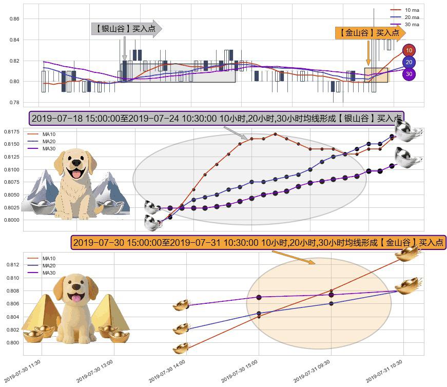 ⚃ 2019-07-31 09:30:00-小时至2019-07-31 10:30:00-小时显现 10小时-20小时-30小时均线 【金山谷】买入点 其再次确认了买入信号,可靠性更强,买入