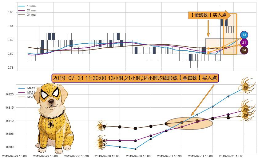 ⚀ 2019-07-31 11:30:00小时显现 13小时-21小时-34小时均线 【金蜘蛛】买入点 看多信号,后市看涨,买入