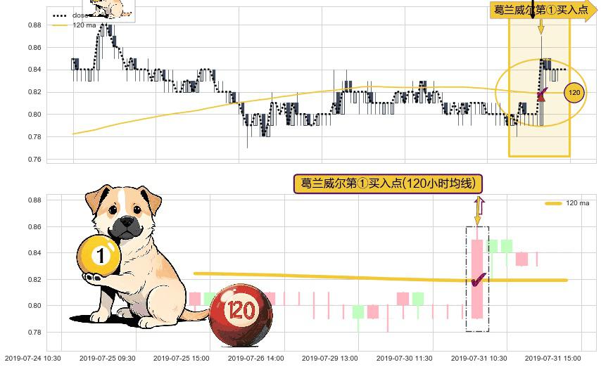 ⚀ 2019-07-30 15:00:00-小时显现 葛兰威尔均线 120小时均线 第买①入点 走势反转见底信号,后市看涨,买进信号