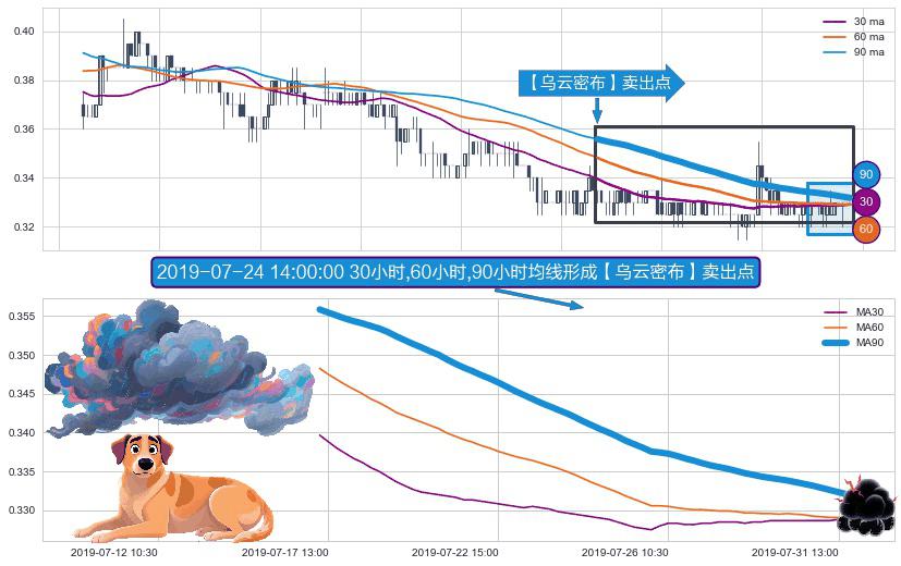 形态多维评估: ⚀ 2019-07-17 11:30:00小时-2019-07-31 15:00:00小时显现 30小时-60小时-90小时均线 【乌云密布】卖出点 看空信号,后市看跌,卖出