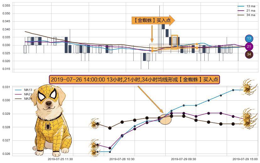 形态多维评估: ⚀ 2019-07-26 14:00:00小时显现 13小时-21小时-34小时均线 【金蜘蛛】买入点 看多信号,后市看涨,买入