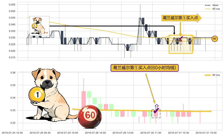 形态多维评估: ⚀ 2019-07-30 10:30:00-小时显现 葛兰威尔均线 60小时均线 第买①入点 走势反转见底信号,后市看涨,买进信号