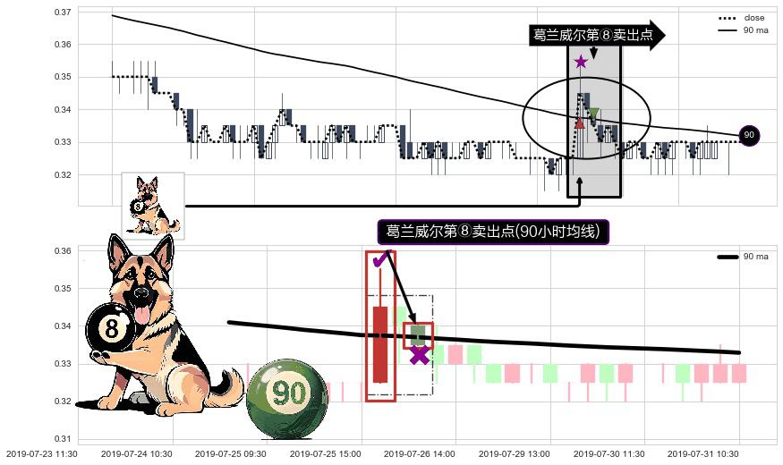 形态多维评估: ⚀ 2019-07-26 11:30:00-小时显现 葛兰威尔均线 90小时均线 第⑧卖出点 下降趋势的中继信号,后市看跌,卖出信号