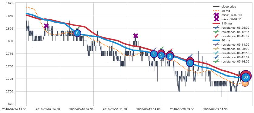 下跌趋势04-24 11:30-07-12 14:00,均线80, 110确认关键阻力5处