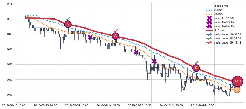 下跌趋势08-10 15:00-10-31 15:00,均线110确认关键阻力3处