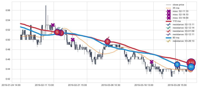 下跌趋势01-24 14:00-03-29 10:30,均线80, 110确认关键阻力5处