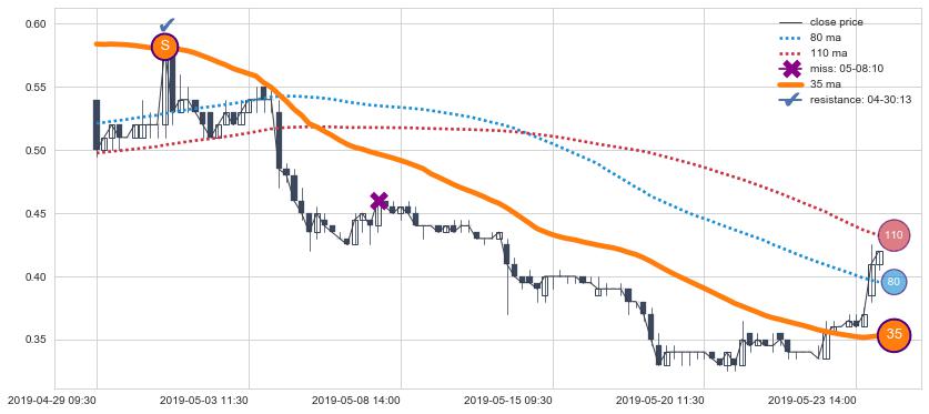 下跌趋势04-29 09:30-05-24 10:30,均线35确认关键阻力1处