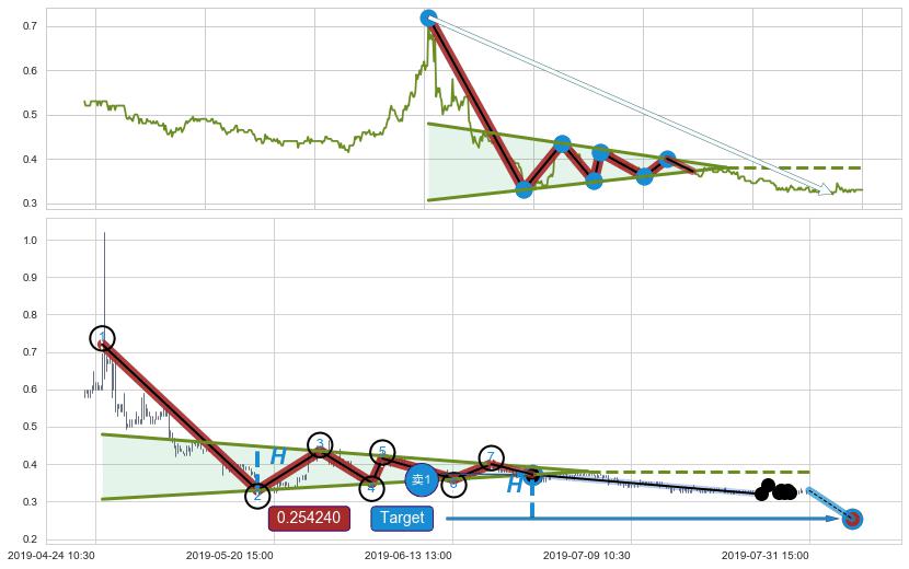➢ 最小中继整理跌幅→𝐇: 0.117760 (低点逐步抬高斜边第一支撑点②与阻力边垂直距离)