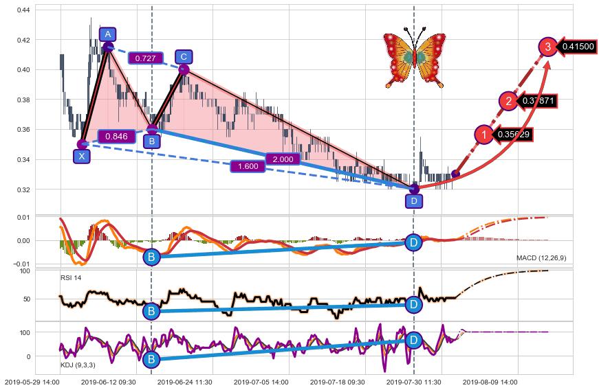 | 8 🅚:【金蜘蛛】买入点 ➕ 📡:谐波蝴蝶已到达d点:猜想c下行到达d点后报复性拉升上涨(均值回复) ☞ 看多信号 ⇥ 【均线】交织【图形】⇥ 综合量化分数: 52 | > |