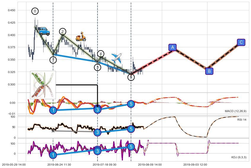 ➢ 1,3,5驱动浪MACD, RSI, KDJ走势都出现【常规背离】反转信号增强