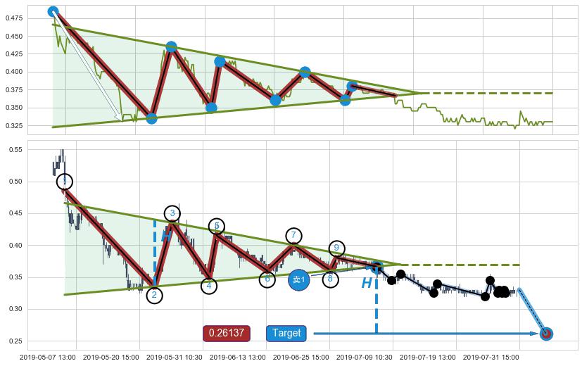 ➢ 最小中继整理跌幅→𝐇: 0.105104 (低点逐步抬高斜边第一支撑点②与阻力边垂直距离)