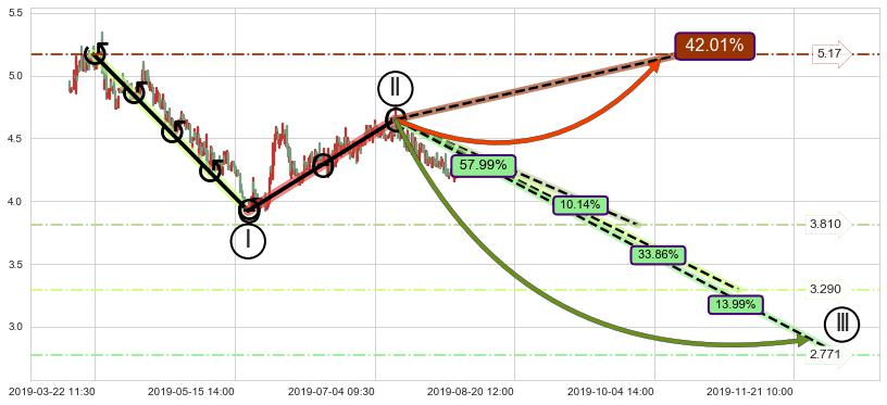 ➣ 调整浪已超过预测的c点位置,后续大趋势循环浪继续下跌概率57.99%,谨慎做多