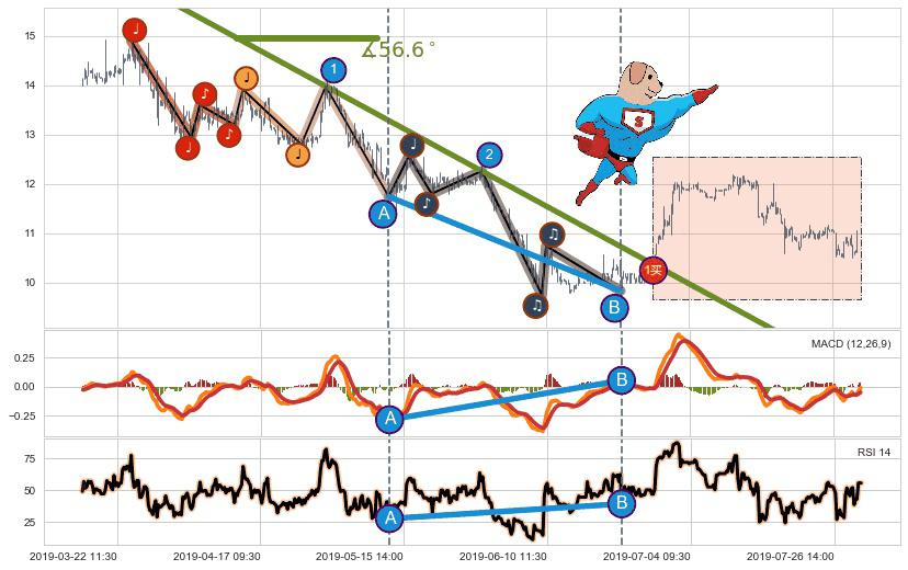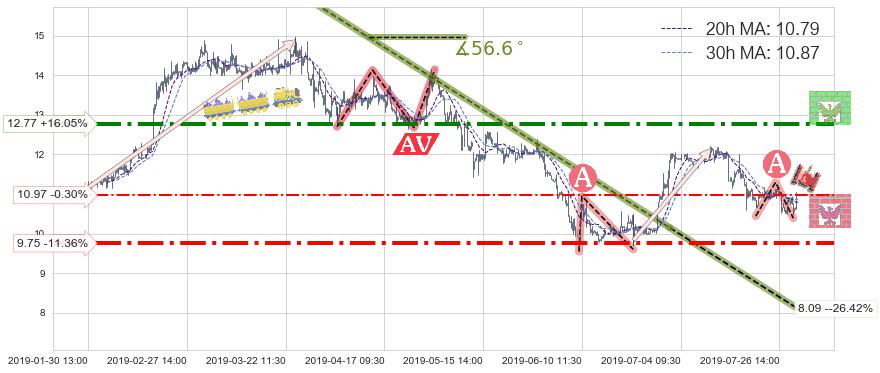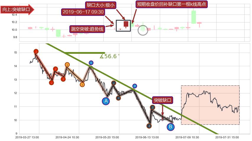 从2019-03-26 09:30至2019-07-02 10:30,共包含380个小时,阶段股价下跌-19.66%,阶段股价变动位移路程比: 1 : 15,下跌趋势角度: 56.6