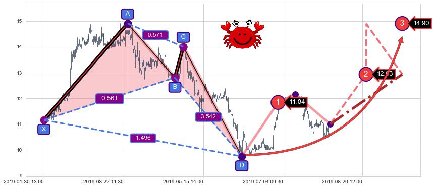 | 12 🅚:【蛟龙出海】买入点 ➕ 📡:谐波螃蟹已到达d点:猜想c下行到达d点后报复性拉升上涨(均值回复) ☞ 看多信号 ⇥ 【均线】交织【图形】⇥ 综合量化分数: 52 | > |