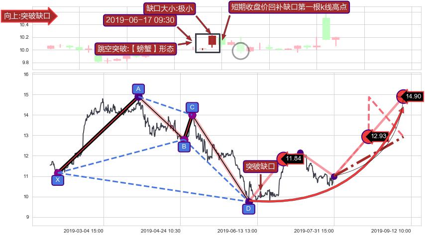 ➣ 突破缺口形成后,后续k已经超过14根,跳空突破【螃蟹】形态关键点后, 出现【完全回踩】迹象,短期收盘价回补缺口第一根k线高点