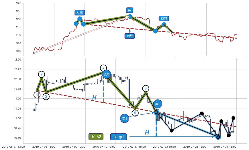 ➣ 【已确认突破】头肩顶 起点:06-25:10,突破点:07-19:09,形态共102交易小时