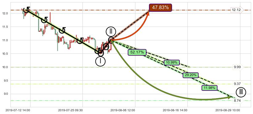 从2019-07-22 14:00至2019-07-31 15:00,共包含44个小时,阶段股价上涨3.23%,阶段股价变动位移路程比: 1 : 8