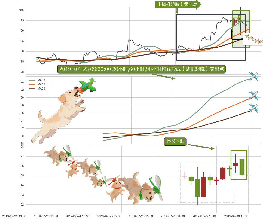 从2019-07-09 15:00至2019-07-31 15:00,共包含97个小时,阶段股价上涨17.96%,阶段股价变动位移路程比: 1 : 3