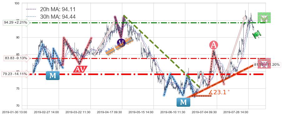 ♘ 阻力价格位94.29,可信任强度69.71%,距离最后交易2019-07-31 15:00形成的收盘价格92.25相差 +2.21%