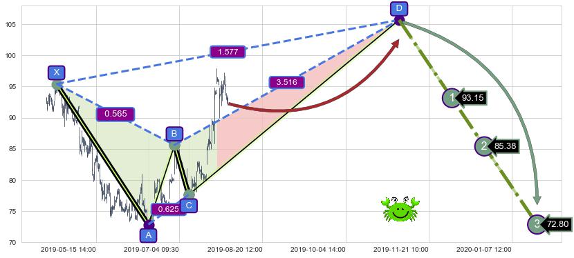 ➢ 距离预测D点位置有足够的上涨空间, 与看跌【螃蟹】形态相反,实际方向【看涨】