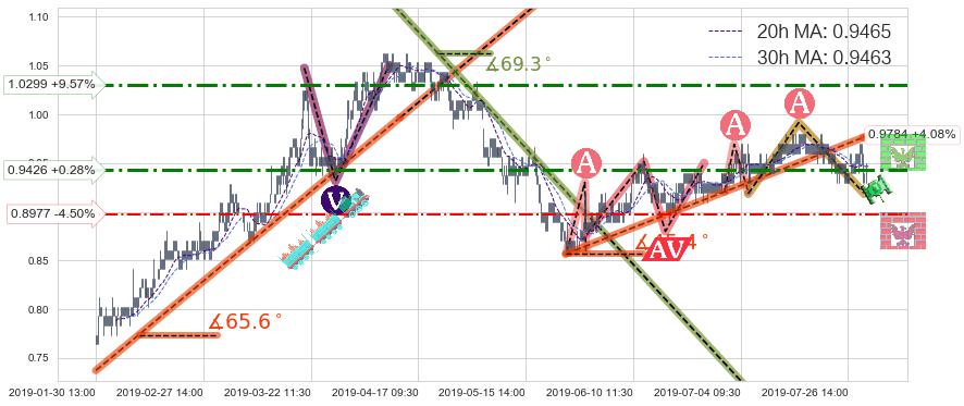 ✂️ 2019-05-23 15:00-2019-07-31 09:30上升趋势存在反转[风险],其原上升趋势的支撑位(0.9784)已破位[强阻力信号],原上升趋势角度: 45.4˚