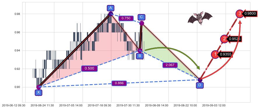 ➣ 未完成【蝙蝠】形态起点X: 06-17:15, 已到达C点: 07-30:15, 预测最终D点: 08-22:15, 共279交易小时