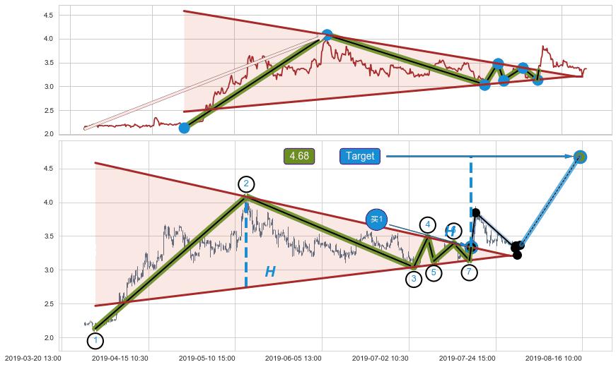 ➢ 最小中继整理涨幅→𝐇: 1.3436 (高点逐步降低斜边第一阻力点②与支撑边垂直距离)