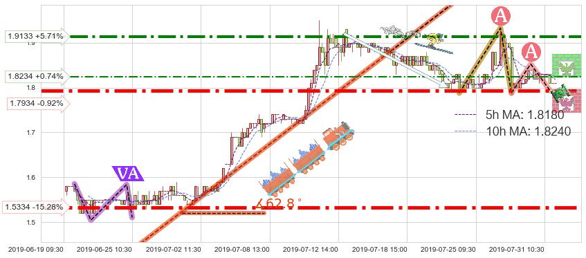 ♘ 阻力价格位1.9133,可信任强度72.67%,距离最后交易2019-07-31 15:00形成的收盘价格1.8100相差 +5.71%