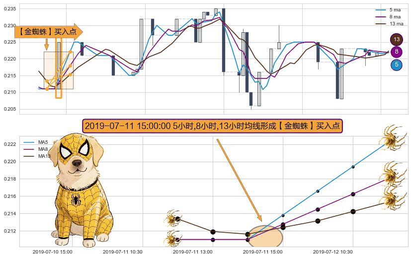 形态多维评估: ⚀ 2019-07-11 15:00:00小时显现 5小时-8小时-13小时均线 【金蜘蛛】买入点 看多信号,后市看涨,买入