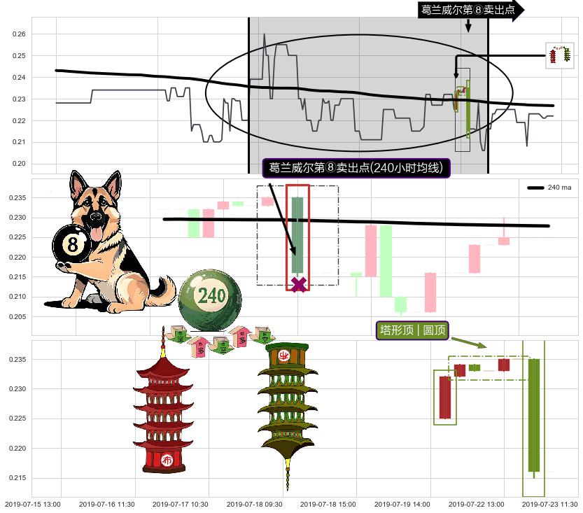 从2019-07-04 09:30至2019-07-24 09:30,共包含85个小时,阶段股价下跌-2.25%,阶段股价变动位移路程比: 1 : 35