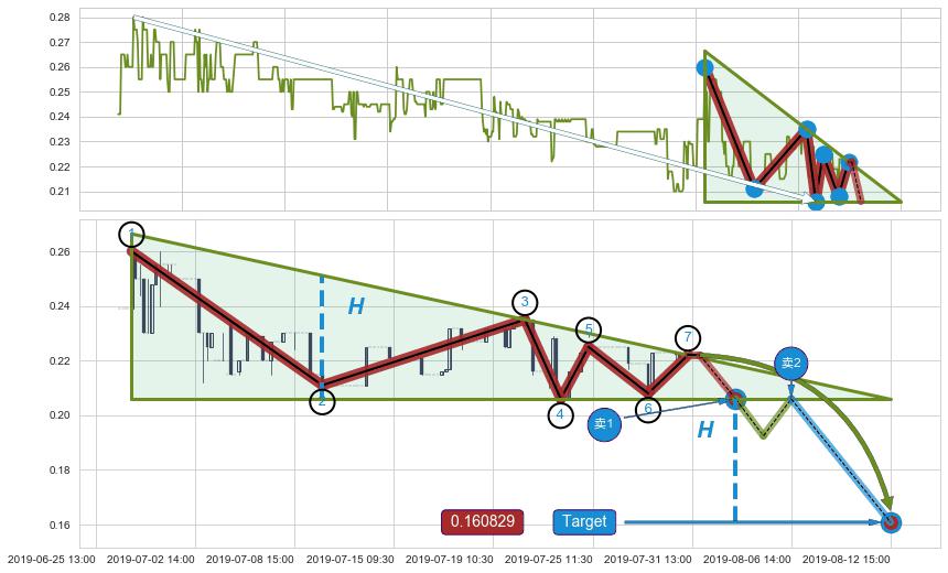➣ 【未确认突破,预测即将形成突破】下降三角形整理起点:06-27:09, 预测突破点:08-02:12,形态共153交易小时