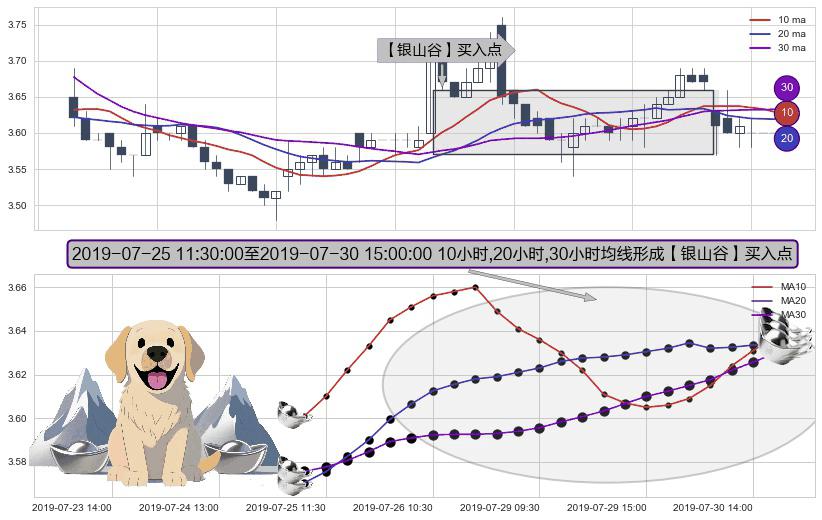 ⚀ 2019-07-25 13:00:00-小时至2019-07-30 15:00:00-小时显现 10小时-20小时-30小时均线 【银山谷】买入点 看多信号,后市看涨,买入