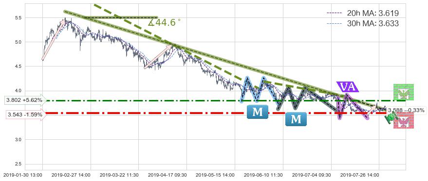 🦴 长线均值回复组合短线趋势跟踪[强阻力信号]2019-02-14 15:00-2019-07-11 09:30下跌趋势依然成立(下跌趋势跟踪依然存在),短线价格略微上行反弹(均值回复猜想),即将接近下跌趋势提供的未破位阻力价格:3.588。